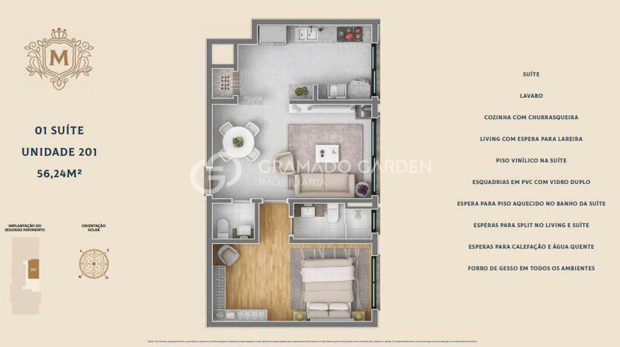Em uma das ruas mais desejadas de Canela, composto por 1 dormitório, banho suíte, lavabo living com espera para lareira, piso vinilico e porcelanato, espera para split, cozinha com área de serviço, 1 vaga de garagem.O Prédio com pátio, jardim e porteiro eletrônico.
